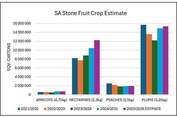 L'industria sudafricana delle drupacee prevede che i volumi di esportazione per la stagione 2025/26 aumenteranno di circa il 5% rispetto all'anno precedente. Le condizioni climatiche favorevoli durante l'inverno e la buona fioritura hanno favorito l'allegagione e la qualità complessiva in gran parte delle zone di produzione.