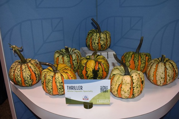 Alla fiera globale dell'IFPA ad Anaheim, la Sakata Seed America ha presentato diverse nuove varietà di zucche. "Una di quelle che ci entusiasma di più è la Thriller. È una zucca commestibile che può essere utilizzata anche come decorazione", afferma Jeff Watkins, responsabile dell'unità aziendale delle cucurbitacee di Sakata. Questa varietà ha vinto il premio All-America Selections (AAS) e, secondo i giudici dell'AAS, la qualità gustativa è di gran lunga superiore rispetto a tipologie simili. Le striature psichedeliche arancioni e verde scuro su uno sfondo color crema la rendono particolarmente accattivante per i consumatori. I colori compaiono precocemente e rimangono vivaci anche dopo la raccolta. La Thriller sarà disponibile in commercio nel 2026.