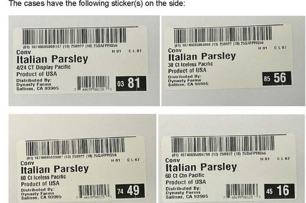 Il prezzemolo richiamato è stato venduto in casse sfuse contenenti 30 o 60 mazzi legati con fascetta, e in sacchetti da 24 mazzi anch'essi con fascetta, destinati alla distribuzione all'ingrosso. Il codice UPC per i mazzi da 30 e 60 è 40695 80125, mentre quello per i sacchetti da 24 è 40695 80120. La durata di conservazione del prodotto era di 18 giorni dalla raccolta, con scadenza intorno al 10 ottobre 2025.