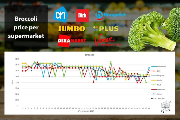 Due forti aumenti di prezzo, +24 centesimi da Albert Heijn e +20 centesimi da DekaMarkt, e la mancanza di broccoli sugli scaffali di Plus e Vomar indicano una disponibilità ridotta del prodotto. Il prezzo medio aumenta così di ben 12 centesimi, passando da 0,98 a 1,10 euro.