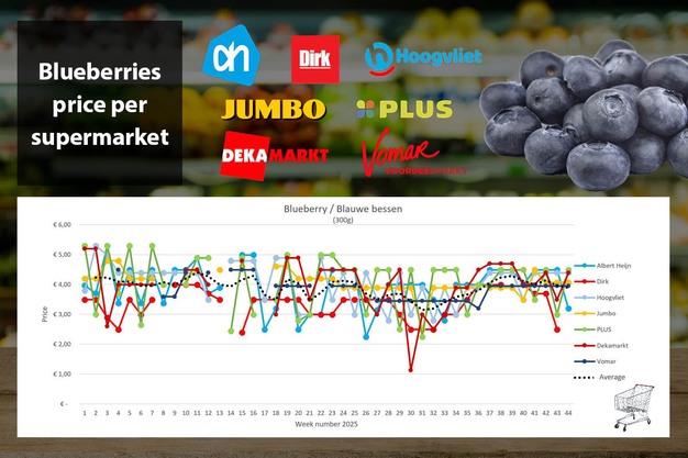 Sebbene Albert Heijn metta i mirtilli in promozione, da 4,49 a 3,19 euro, nella settimana 44 non si registrano ulteriori offerte. Da Dirk, i mirtilli risultano assenti dagli scaffali. Il prezzo medio del prodotto torna a salire: +38 centesimi, raggiungendo 4,08 euro.