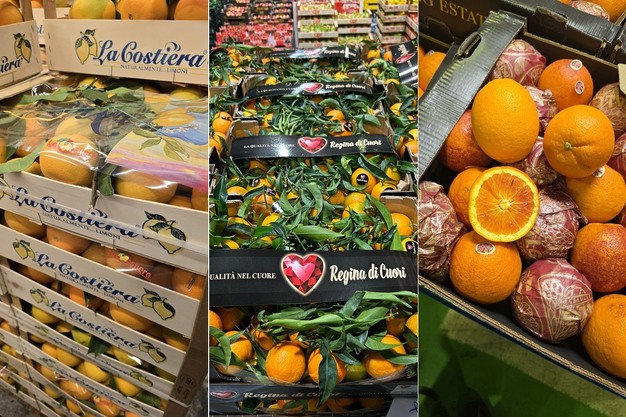 La gamma di agrumi: da sinistra a destra, limoni con foglie e clementine di origine italiana e arance rosse Tarocco dal Sudafrica