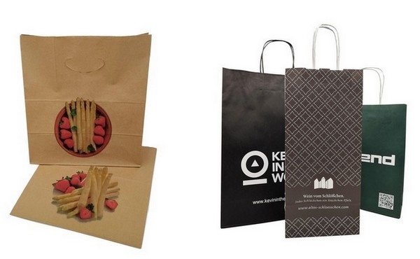 Panoramica della gamma di sacchetti Gernet. Oltre ai sacchetti di carta di pregio per frutta, verdura e patate, l'azienda è specializzata anche nel miglioramento e nella commercializzazione di sacchetti per vino (a destra).
