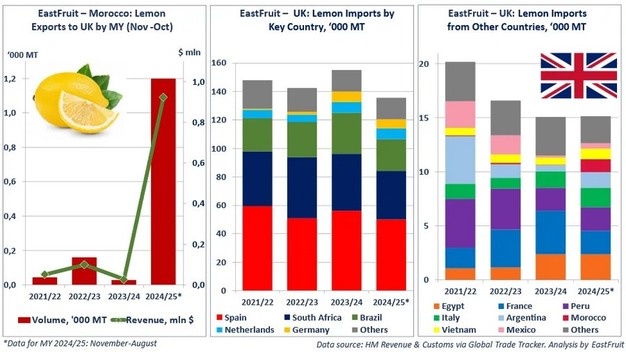 Gli analisti di EastFruit segnalano un forte aumento delle esportazioni di limoni marocchini verso il Regno Unito tra novembre 2024 e agosto 2025. In questo periodo, il Marocco ha spedito 1.200 tonnellate di limoni verso il Regno Unito, per un valore di 920mila dollari. Il volume esportato è stato 40 volte superiore rispetto alla campagna di commercializzazione precedente e ha superato le esportazioni totali di limoni del Paese verso il Regno Unito nell'ultimo decennio.