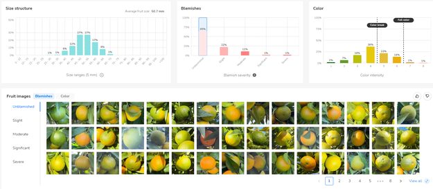 Si tratta di un lavoro lungo e meticoloso, ma indispensabile per anticipare i volumi per ciascun calibro. Quest'anno, tuttavia, l'azienda ha scelto di sperimentare un'applicazione sviluppata dalla start-up Aerobotics, che utilizza semplici foto scattate nei frutteti per analizzare i calibri, il colore e gli eventuali difetti di migliaia di clementine. Da tutti questi dati, lo strumento traccia una curva di crescita dei frutti, settimana per settimana, che evolve fino a prevedere il calibro del frutto al momento della raccolta.