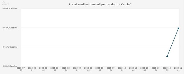 Su base mensile, ottobre 2025 si era chiuso con un prezzo medio dell'aglio di 2,99 €/kg (+6,3% sul mese precedente, -1,3% annuo), bietole a 0,57 €/kg (-26%), carciofi a 0,60 €/capolino (+33,3%), carote a 0,23 €/kg (-37,2%), cavolfiori a 0,94 €/kg (-38,4%, -6,1%), cavoli broccoli a 0,90 €/kg (+20%), cavoli cappucci a 0,94 €/kg (+18,9%), cavoli verza a 0,57 €/kg (-8,2%, -25,3%) e cetrioli serra a 0,63 €/kg (+14,5%, -23,2%).