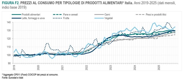 I beni alimentari rappresentano nel 2025 oltre un quinto del valore economico dei beni e servizi consumati dalle famiglie italiane. Il solo cibo rappresenta, in media, il 16,6% della spesa. Trattandosi di beni in prevalenza necessari, si caratterizzano per la rigidità della loro domanda rispetto ad aumenti di prezzo. Inoltre, gli incrementi dei listini hanno un impatto rilevante sul potere di acquisto delle famiglie, soprattutto quelle a più basso reddito in considerazione della maggiore quota dei beni alimentari rispetto al totale dei consumi. Da ottobre 2021 a ottobre 2025, i beni alimentari hanno registrato aumenti di prezzo del 24,9%, un incremento superiore di quasi 8 punti percentuali rispetto a quanto evidenziato nello stesso periodo dall'indice generale dei prezzi al consumo armonizzato. A rivelarlo è l'Istat nel suo Focus "Le principali determinanti della crescita dei prezzi dei beni alimentari in Italia tra il 2021 e il 2025".