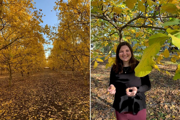 A sinistra: un noceto a novembre. A destra: la figlia di Carriere, Christina, al momento della raccolta.