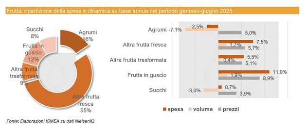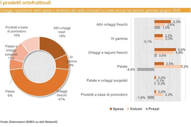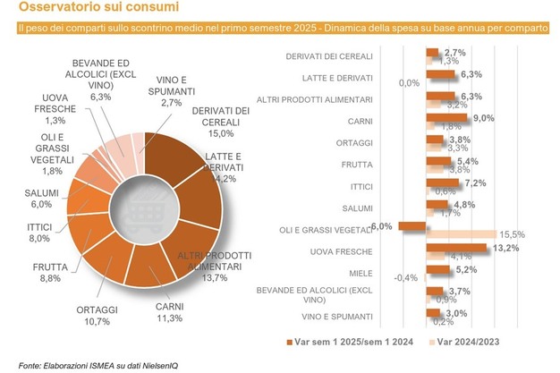 Nel primo semestre 2025 la spesa degli italiani per il consumo alimentare domestico è cresciuta del 5,2% rispetto all'anno precedente, dopo il +2% del 2024. Come nel 2024, la crescita continua a non essere trainata solo dai prezzi, ma anche dai volumi di molti dei principali prodotti nel carrello della spesa. La pressione promozionale non si intensifica, con la quota della spesa interessata dalle promozioni che passa dal 23,8% nei primi sei mesi del 2024 al 23,6% dei primi sei mesi del 2025. La crescita della spesa alimentare è stata di diversa intensità a livello territoriale: più marcata al Sud (+6,9%), seguita dal Centro (+5,2%), dal Nord-Ovest (+5%) e dal Nord-Est (+3,5%).