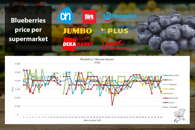 PLUS propone nella settimana 46 l'offerta più interessante sui mirtilli: da 4,49 euro a 2,29 euro per 300 g, il prezzo più basso rispetto agli altri supermercati analizzati. Anche Dirk mette in evidenza i mirtilli con uno sconto di un euro sul prezzo normale (2,69 euro per 300 g). Le offerte di Albert Heijn, Hoogvliet e DekaMarkt sono terminate. Il prezzo medio dei mirtilli risulta leggermente più alto rispetto alla settimana 45: 3,78 euro (+2 centesimi).