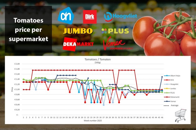 I dati sui prezzi provengono da Supermarktscanner.nl e si basano sui prezzi online nei negozi web di Albert Heijn, Jumbo, Plus, DekaMarkt, Dirk e Hoogvliet. Il prezzo riportato è una media che include anche le promozioni. In questa comparazione non si tiene conto di origine e qualità, poiché la maggior parte dei supermercati non fornisce queste informazioni sui propri siti. Solo Hoogvliet e Jumbo indicano il Paese d'origine. È quindi possibile che si confrontino, ad esempio, avocado acerbi con maturi, o cetrioli spagnoli con quelli olandesi.