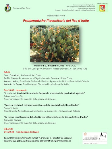 Un momento di approfondimento sulle fitopatologie del ficodindia si è tenuto a San Cono, conosciuta come la "capitale del ficodindia", mercoledì 12 novembre. L'iniziativa è stata promossa dal Distretto Ficodindia di Sicilia, con il patrocinio dell'Ordine degli Agronomi e dei Forestali di Catania.