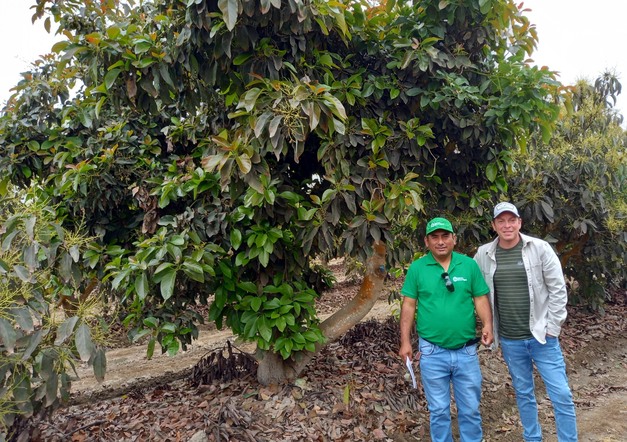 Guido García Mendoza (responsabile delle operazioni) e Claudio Villegas (proprietario dell'azienda agricola) davanti a un albero della varietà Zutano. "In questo appezzamento di 8 ettari di avocado Hass ci sono circa 105 alberi di Zutano che fungono da impollinatori", dice Villegas che, dopo tre anni di collaborazione con il Gruppo Juan Ruiz, sottolinea di sentirsi accompagnato e sostenuto in tutto il processo di coltivazione e commercializzazione. "Inoltre, non subisco perdite per lo scarto della frutta, perché il gruppo acquista tutta la mia produzione".