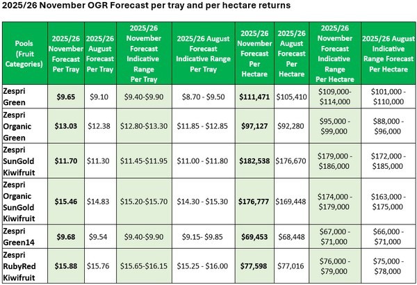 Zespri ha pubblicato le previsioni di novembre per la stagione 2025/26 dei kiwi, riportando stime di rendimento per vassoio più elevate rispetto alle previsioni di agosto per tutti i gruppi di frutta. L'azienda ha dichiarato che i rendimenti dei kiwi Green, Organic Green e Organic SunGold hanno superato il limite massimo della precedente forbice di previsione. Per quanto riguarda il rendimento per ettaro, si prevedono attualmente risultati record in tutte le categorie.