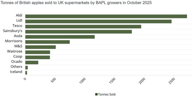 Nuovi dati forniti dai coltivatori inglesi di mele e pere mostrano un forte sostegno alle mele nazionali da parte di diversi supermercati del Regno Unito nell'ottobre 2025, con chiare differenze tra i rivenditori sia in termini di volume totale venduto che di quota di mele inglesi rispetto alla quota di mercato dei prodotti alimentari.