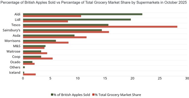 Aldi e Lidl si distinguono per aver venduto una percentuale di mele inglesi superiore a quella che suggerirebbe la loro quota di mercato complessiva. Entrambi i discount continuano a primeggiare nell'approvvigionamento di mele nazionali, sostenendo una quota maggiore della produzione dei coltivatori inglesi rispetto alla loro posizione nel mercato alimentare più ampio.