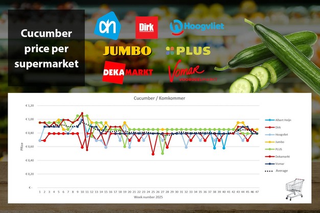 I dati sui prezzi provengono da Supermarktscanner.nl e si basano sui prezzi online nei negozi web di Albert Heijn, Jumbo, Plus, DekaMarkt, Dirk e Hoogvliet. Il prezzo riportato è una media che include anche le promozioni. In questa comparazione non si tiene conto di origine e qualità, poiché la maggior parte dei supermercati non fornisce queste informazioni sui propri siti. Solo Hoogvliet e Jumbo indicano il Paese d'origine. È quindi possibile che si confrontino, ad esempio, avocado acerbi con maturi, o cetrioli spagnoli con quelli olandesi.
