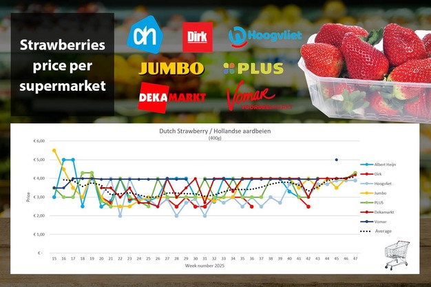 Il prezzo delle fragole è chiaramente in aumento e in tre dei quattro supermercati esaminati, che hanno ancora fragole nel loro assortimento online, supera abbondantemente i 4 euro. Sia Albert Heijn, Jumbo sia PLUS aggiungono 0,30 euro al prezzo della settimana 46. DekaMarkt aumenta il prezzo di 0,20 euro. Hoogvliet mantiene la quotazione sotto i 4 euro, a 3,89 euro per 400 grammi. In media, il prezzo settimanale medio nella settimana 47 per una confezione da 400 grammi di fragole aumenta notevolmente a 4,19 euro (+22 centesimi). Dirk e Vomar non vendono fragole online.