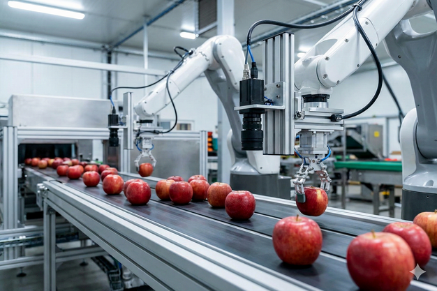 © AI GeminiVisione Artificiale e Controllo Qualità Questa immagine mostra un sistema automatizzato che utilizza bracci robotici e telecamere per la selezione delle mele, un esempio perfetto di come la computer vision possa essere applicata direttamente sulla linea di produzione.