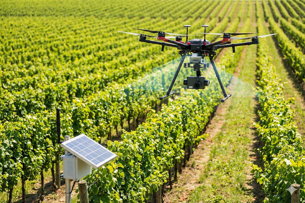 © AI GeminiAgricoltura di Precisione (Smart Farming): un drone che sorvola un vigneto, affiancato da una stazione di sensori a terra. Rappresenta l'uso della tecnologia per raccogliere dati in campo e ottimizzare l'uso delle risorse.