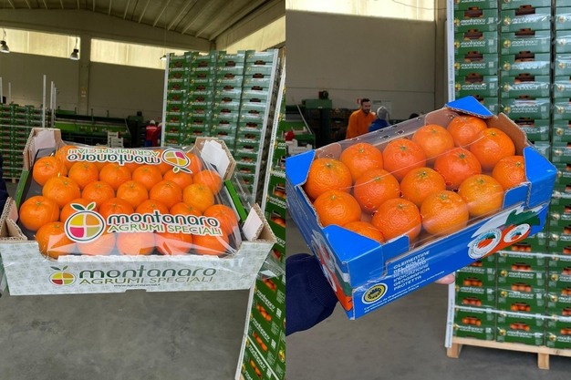 © Montanaro Agrumi SpecialiNella foto a destra: packaging aziendale. A destra, cassette del Consorzio di Tutela IGP Clementine del Golfo di Taranto.