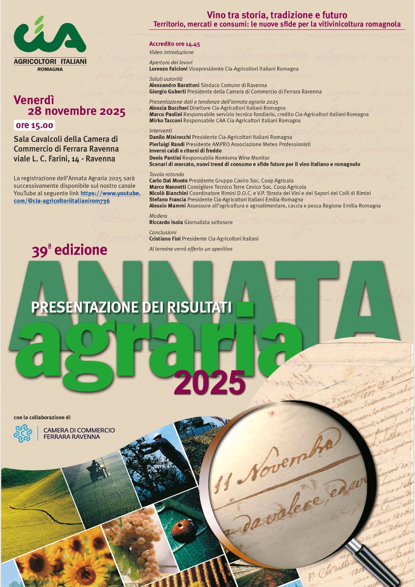 Vi sarà l'esposizione in sintesi dell'andamento 2025 delle colture nelle tre province di Ravenna, Forlì-Cesena e Rimini con un'analisi complessiva dell'agricoltura romagnola, dei suoi principali comparti produttivi e confronti con gli anni precedenti dell'evoluzione di superfici, rese, problematiche e nuove sfide. Saranno il direttore e i tecnici di Cia Romagna a presentare le tendenze, rispettivamente Alessia Buccheri, Marco Paolini e Mirko Tacconi; gli interventi di Danilo Misirocchi, presidente Cia Romagna; Pierluigi Randi, presidente AMPRO Associazione Meteo Professionisti su "Inverni caldi e ritorni di freddo"; Denis Pantini, responsabile Nomisma Wine Monitor che inquadra "scenari di mercato, nuovi trend di consumo e sfide future per il vino italiano e romagnolo". Le conclusioni dei lavori spettano a Cristiano Fini, presidente di Cia nazionale.