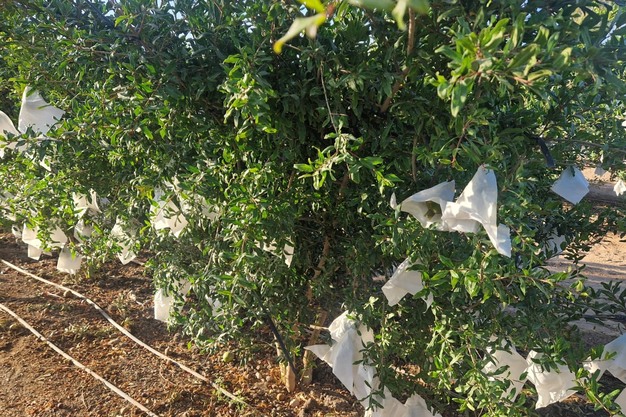 Il 70% delle melagrane di Fundo América viene avvolto in sacchetti di carta per evitare le scottature solari. Questo lavoro si svolge nel mese di settembre, quattro mesi prima dell'inizio della raccolta.