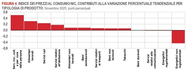 La dinamica tendenziale dei prezzi dei beni risente del rallentamento della flessione di quelli dei beni energetici (da -4,4% a -4,2%; +0,6% su ottobre). I prezzi degli energetici regolamentati registrano una flessione più accentuata (da -0,5% a -3,3%%; -0,2% su ottobre). I prezzi degli energetici non regolamentati mostrano una risalita su base annua (da -4,9% a -4,4%; +0,6% su ottobre), che riflette l'andamento dei prezzi dei combustibili solidi (in accelerazione da +1,7% a +4,5%; +1,7% su ottobre), del gasolio per mezzi di trasporto (con l'inversione di tendenza da -0,1% a +2,1%; +2,6% su ottobre), dell'energia elettrica mercato libero (da -9,9% a -7,7%; nullo il congiunturale), del gasolio per riscaldamento (da -1,4% a -0,3%; +1,9% su ottobre) e della benzina (da -2,7% a -2,2%; +0,8% su ottobre).