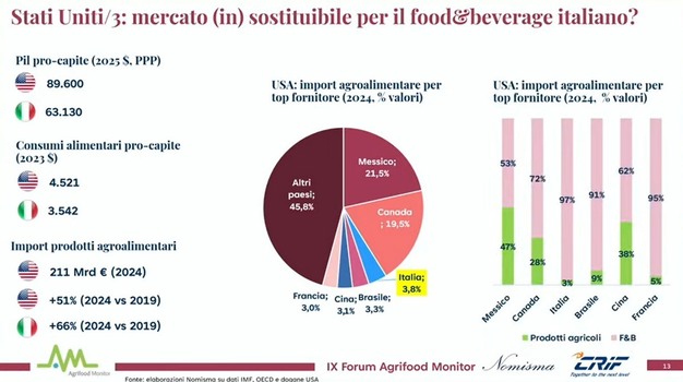 Un dato particolarmente allarmante se si considera che il mercato americano è di fatto insostituibile. "Gli Stati Uniti combinano un Pil pro capite elevato, consumi alimentari tra i più alti al mondo e un mercato di quasi 400 milioni di abitanti", ricorda Pantini. Importano ogni anno oltre 200 miliardi di euro di prodotti agroalimentari e l'Italia è oggi il terzo fornitore, con una crescita del 66% in cinque anni. In alcune categorie, i prezzi medi ottenuti in USA sono nettamente superiori rispetto agli altri mercati, rendendo difficile individuare alternative comparabili.