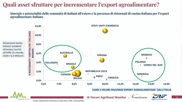 Il tema della diversificazione apre però uno spiraglio. Pantini segnala due asset che nessun altro Paese possiede con pari intensità: la rete mondiale dei ristoranti certificati di cucina italiana e la presenza storica delle comunità italiane all'estero. Incrociando questi elementi con i dati dell'ultimo decennio emergono mercati ad alto potenziale come Australia, Brasile, Thailandia, Messico, Polonia, Corea del Sud e Romania.