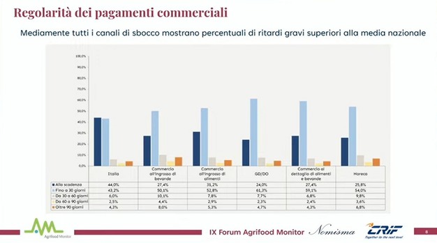 Un segnale positivo arriva però dai pagamenti lungo la filiera: l'84% avviene entro 30 giorni e i ritardi gravi non aumentano in nessun canale, dal retail all'horeca. Ciò indica una tenuta complessiva della domanda, nonostante il calo del potere d'acquisto delle famiglie.