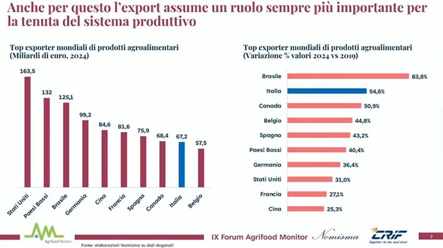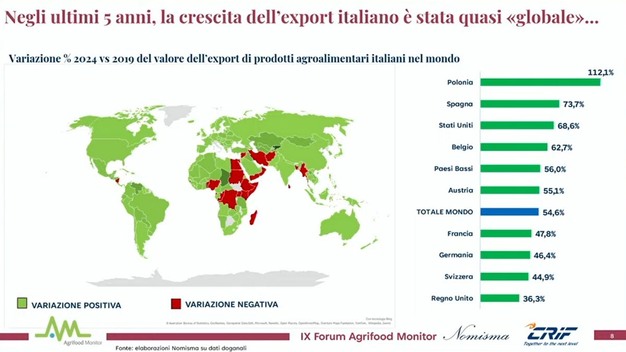 Secondo lo studio Nomisma, l'export resta il principale motore della competitività: nel 2024 l'Italia ha raggiunto 67,2 miliardi di euro di export agroalimentare, posizionandosi come nono esportatore mondiale e secondo Paese per crescita nell'ultimo quinquennio, con un +55%. Una progressione diffusa su quasi tutti i mercati, con performance eccezionali in Polonia (+112%), Spagna (+74%) e Stati Uniti (+69%). Ma questa forza nasconde una fragilità: metà delle esportazioni dipende da soli cinque mercati - Germania, USA, Francia, Regno Unito e Spagna - una concentrazione che in tempi di instabilità rende urgente una strategia di diversificazione.