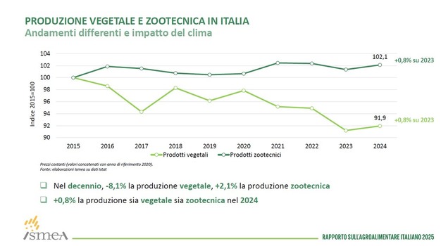 L'analisi della produzione agricola nazionale (calcolata a prezzi costanti con anno di riferimento 2020) rivela una flessione significativa nel lungo periodo: la produzione vegetale ha subito un calo complessivo dell'8,1% nell'ultimo decennio. Tuttavia, il 2024 ha segnato una modesta inversione di rotta per questa categoria. "Nello scorso anno, infatti, la produzione vegetale ha registrato una crescita dello 0,8% rispetto al 2023. Questo andamento positivo si allinea alla crescita generale della produzione agricola (+2,8%) e del Valore Aggiunto agricolo (+2%) registrata nello stesso anno".