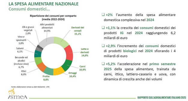 Nonostante un aumento complessivo della spesa alimentare domestica del 2% nel 2024, e una spinta accelerata nel primo semestre 2025 trainata principalmente da carni, ittico, lattiero-caseario e uova, la centralità del consumo interno, mirata alla qualità che caratterizza l'agroalimentare italiano, viene indicata come elemento chiave per il futuro.