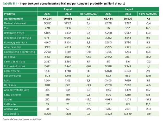 L'agroalimentare italiano emerge dal Rapporto Ismea 2025 - presentato ieri, 3 dicembre 2025, a Roma - come un settore solido e trainante dell'economia nazionale, capace di raggiungere primati europei in termini di valore aggiunto agricolo, qualità certificata, produttività ed export, che nel 2024 ha sfiorato i 70 miliardi di euro. Con una filiera che pesa il 15% del PIL e investimenti privati ai massimi storici, l'Italia registra anche una crescita dell'occupazione agricola e del reddito tra le più alte dell'Unione europea. Tuttavia, lo scenario resta segnato da tensioni geopolitiche e dai nuovi dazi statunitensi, il cui impatto potrà essere valutato con precisione solo dal 2026. Intanto, il Governo ha destinato oltre 15 miliardi di euro negli ultimi tre anni per rafforzare filiere, innovazione e ricambio generazionale nel settore.