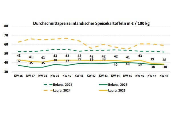 Il mercato delle patate della Renania-Palatinato rimane sostanzialmente invariato. Le merci provenienti da stoccaggi temporanei e intermedi continuano a invadere il mercato a prezzi bassi. La qualità di queste merci è limitata, quindi le merci di alta qualità conservate con sovrapprezzi stanno trovando sempre più spazio sugli scaffali. Dopo un novembre tranquillo, gli operatori di mercato prevedono un aumento della domanda durante le festività natalizie.