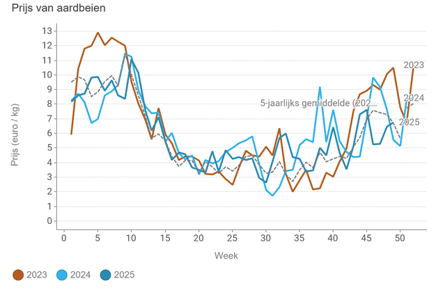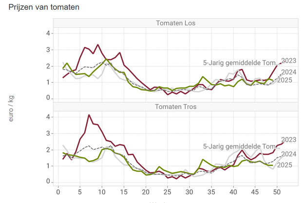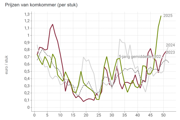 I prezzi medi attuali sono notevoli se confrontati con quelli degli anni passati, quando nel 2020 in questo periodo non si superava 0,85 euro al pezzo. Già allora era un valore eccezionalmente alto. La coltivazione tradizionale non illuminata è terminata e la coltivazione illuminata è stata ripresa dopo anni di crisi energetica, ma non con volumi paragonabili a quelli della coltivazione non illuminata. Inoltre, presso alcuni coltivatori la coltivazione illuminata dei cetrioli deve ancora iniziare.