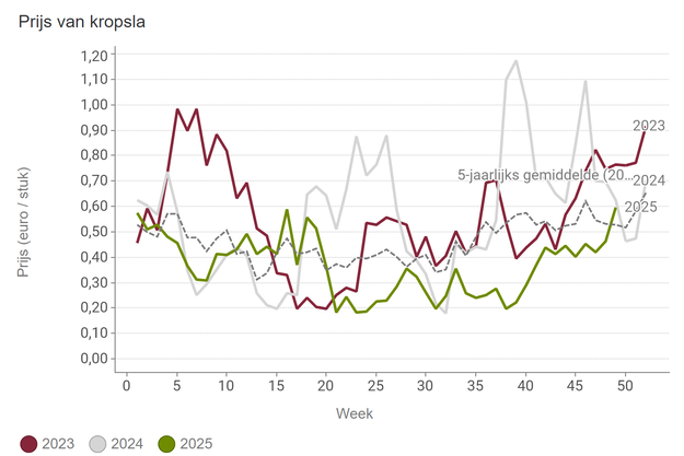 Il prezzo medio della lattuga è salito la scorsa settimana al di sopra della media quinquennale. È la prima volta che succede dall'inizio di maggio. Il prezzo medio al pezzo nella settimana 49 è stato di 0,60 euro.