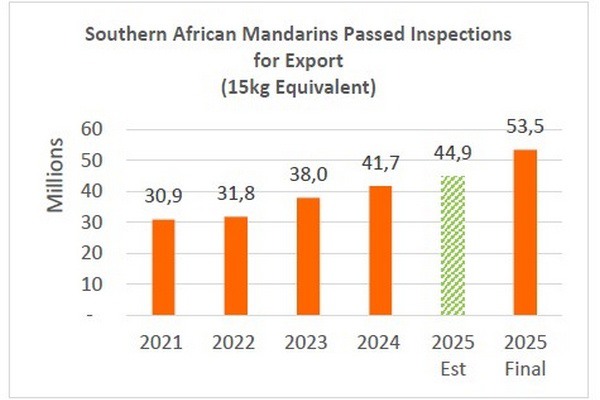 In Sudafrica la stagione 2025 dei mandarini si è conclusa con volumi di produzione più elevati e un output di confezionamento che ha costantemente superato le aspettative iniziali. Il Focus Group ha rivisto al rialzo le sue previsioni durante tutta la stagione, chiudendo con un volume finale imballato di 53,5 milioni di cartoni, rispetto a una stima iniziale di 44,9 milioni di cartoni. Ciò riflette un aumento del 19% rispetto alla prima previsione.