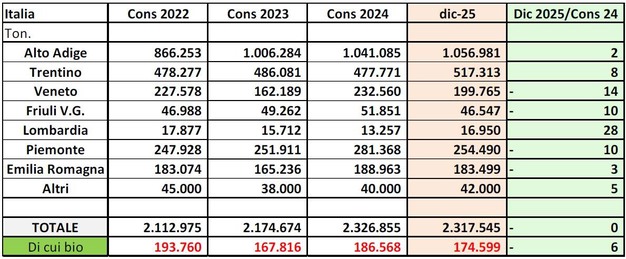 A livello regionale, l'Alto Adige registra un leggero incremento del 2% rispetto all'anno precedente, con 1.056.981 tonnellate, mentre il Trentino cresce dell'8%, arrivando a 517.313 tonnellate. In Piemonte, invece, la produzione diminuisce del 10%, mentre il Veneto, nonostante un calibro generalmente migliore, diminuisce del 14% a causa di alcuni problemi di grandine. Una quota significativa della produzione veneta, pari al 43% del totale, viene destinata all'industria tramite programmi dedicati. L'Emilia-Romagna mostra una produzione leggermente ridotta del 3%, mentre il Friuli registra un calo del 10% e la Lombardia, al contrario, recupera con un aumento del 28%.