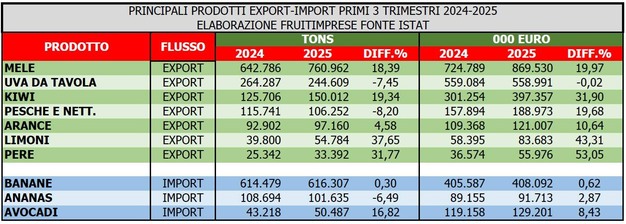 Non benissimo l'uva da tavola che già nei primi mesi di commercializzazione dava segnali di una campagna che si sarebbe dimostrata difficile, con un export costante in termini di valore, ma in discesa del 7,45% rispetto allo stesso periodo del 2024. Discorso analogo per pesche e nettarine che perdono l'8,2% in volume e del 19,68% in valore.
