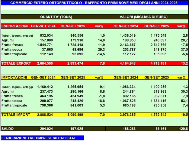Fatte salve le esportazioni di frutta tropicale, che si riducono del 14,5% in quantità e del 5,6% in valore, tutti i principali comparti segnano numeri positivi. La frutta fresca registra un aumento dell'export del 11,9% in volume e del 17,5% in valore, gli agrumi del 14% in quantità e del 20,7% in valore, la frutta secca del 29,3% in volume e del 37,5% in valore; pressoché costanti le esportazioni di tuberi, legumi e ortaggi che crescono dell'1% in quantità e del 2,8% in valore rispetto ai primi 3 trimestri dell'anno precedente.
