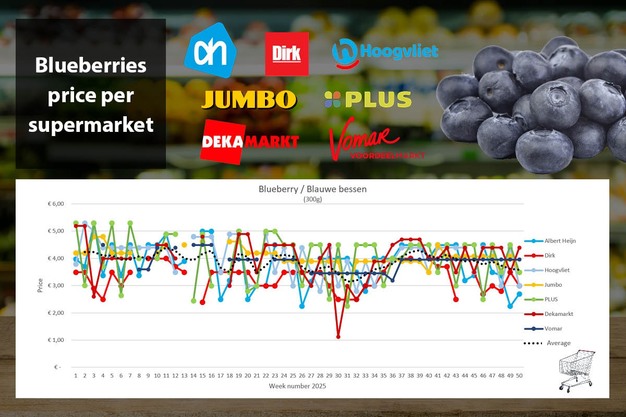 Ancora moltissime promozioni sui mirtilli. Albert Heijn ha il prezzo più basso: 2,69 euro per una confezione da 300 grammi. Seguono Dirk e Hoogvliet, con un prezzo di 2,99 euro; anche Jumbo e Plus flettono i prezzi, ma con 3,49 euro resta una forte differenza. DekaMarkt non ha offerte e arriva a 4,39 euro. Il prezzo medio settimanale scende di 30 centesimi, attestandosi a 3,43 euro.