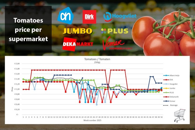 Aumento di prezzo di 10 centesimi per 500 grammi di pomodori a grappolo sfusi da Albert Heijn (1,05 euro) e da PLUS (99 centesimi), entrambi con un incremento di 10 centesimi. Hoogvliet non ha pomodori a grappolo sfusi disponibili online. In media il prezzo settimanale aumenta di 6 centesimi, arrivando a 1,04 euro.