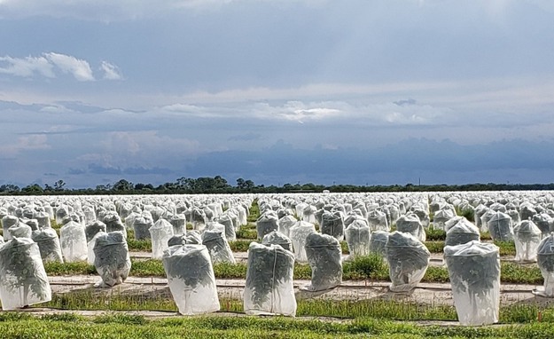 Gli alberi in Florida (USA) vengono coperti per prevenire l'attacco di D. citri. Foto fornita dall'Istituto valenciano di investigazioni agrarie (IVIA).