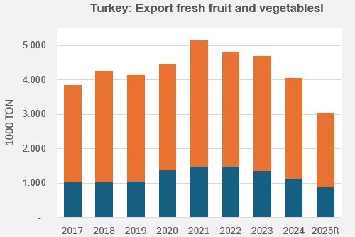 Si prevede che le esportazioni totali di frutta e verdura della Turchia raggiungeranno poco più di 3 milioni di tonnellate quest'anno. Nel 2024, ammontavano ancora a 4,1 milioni di tonnellate e nel 2023 a circa 4,7 milioni di tonnellate. Nel 2021 sono state esportate oltre 5 milioni di tonnellate.