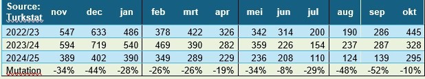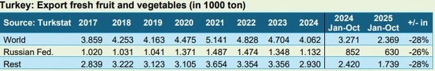 Le esportazioni di prodotti ortofrutticoli turchi sono diminuite notevolmente quest'anno verso quasi tutti i mercati di destinazione. La Russia rimane di gran lunga il principale acquirente, con una quota di poco inferiore al 30% delle esportazioni totali. Nei primi dieci mesi del 2025, le esportazioni verso la Russia sono diminuite di oltre un quarto. Si prevede che questo porterà il volume al di sotto della soglia di 1 milione di tonnellate, per la prima volta da molto tempo. Solo pochi anni fa, le esportazioni verso la Russia si attestavano su circa 1,4 milioni di tonnellate.