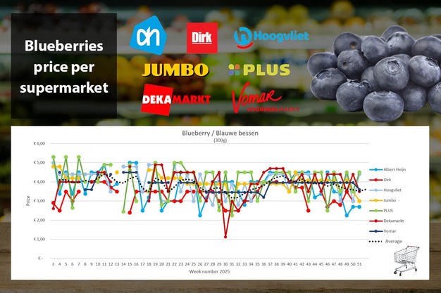 Nonostante i numerosi ribassi nella settimana 51, Albert Heijn resta di gran lunga il più conveniente per i mirtilli. Per la seconda settimana consecutiva, il prezzo promozionale è di 2,69 euro per una vaschetta da 300 grammi. Jumbo propone nella settimana 51 un prezzo promozionale di 2,99 euro, mentre DekaMarkt riduce il prezzo di 90 centesimi a 3,49 euro e Vomar di 36 centesimi, sempre a 3,49 euro. Le promozioni da Hoogvliet e Plus sono terminate. Da Dirk i mirtilli sono assenti dallo scaffale online. Il prezzo medio settimanale aumenta di 18 centesimi, arrivando a 3,61 euro.
