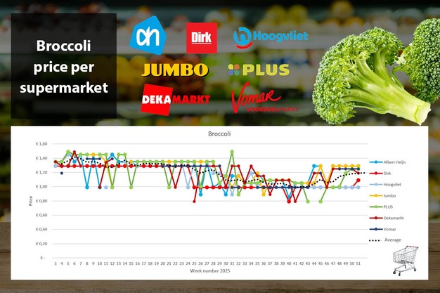 Si distingue Hoogvliet, che nella settimana 51 mantiene il prezzo dei broccoli appena sotto l'euro (per 500 grammi). Dirk aumenta il prezzo di 10 centesimi, portandolo a 1,09 euro. DekaMarkt riduce il prezzo di 6 centesimi e arriva a 1,19 euro. I prezzi dei supermercati nazionali sono pari a 1,29 euro (Albert Heijn e Jumbo), mentre Plus si colloca 4 centesimi al di sotto.