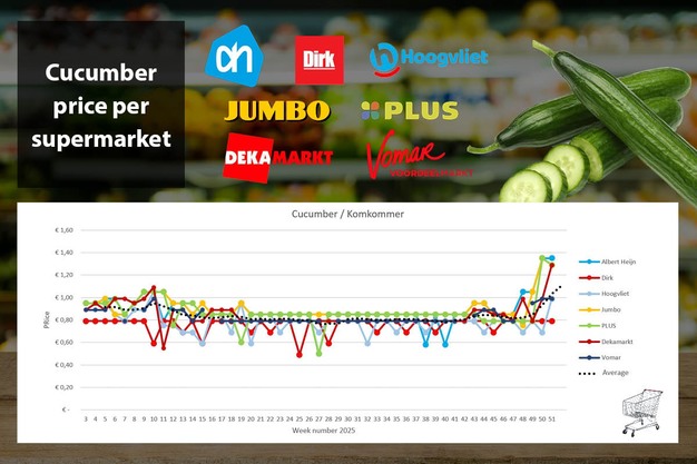 Dopo i forti aumenti di prezzo della scorsa settimana nei supermercati nazionali Albert Heijn, Jumbo e Plus, questa settimana seguono quelli regionali (+20 centesimi da Dirk; +30 centesimi da DekaMarkt), ad eccezione di Vomar, che rimane a 99 centesimi. Anche Dirk si allinea a questo livello. Negli altri supermercati il prezzo è nettamente superiore. Colpisce inoltre il fatto che sia Jumbo sia Plus riducano il prezzo dei cetrioli del 6%, da 1,35 a 1,29 euro. La quotazione media settimanale continua a salire e si attesta a 1,14 euro.
